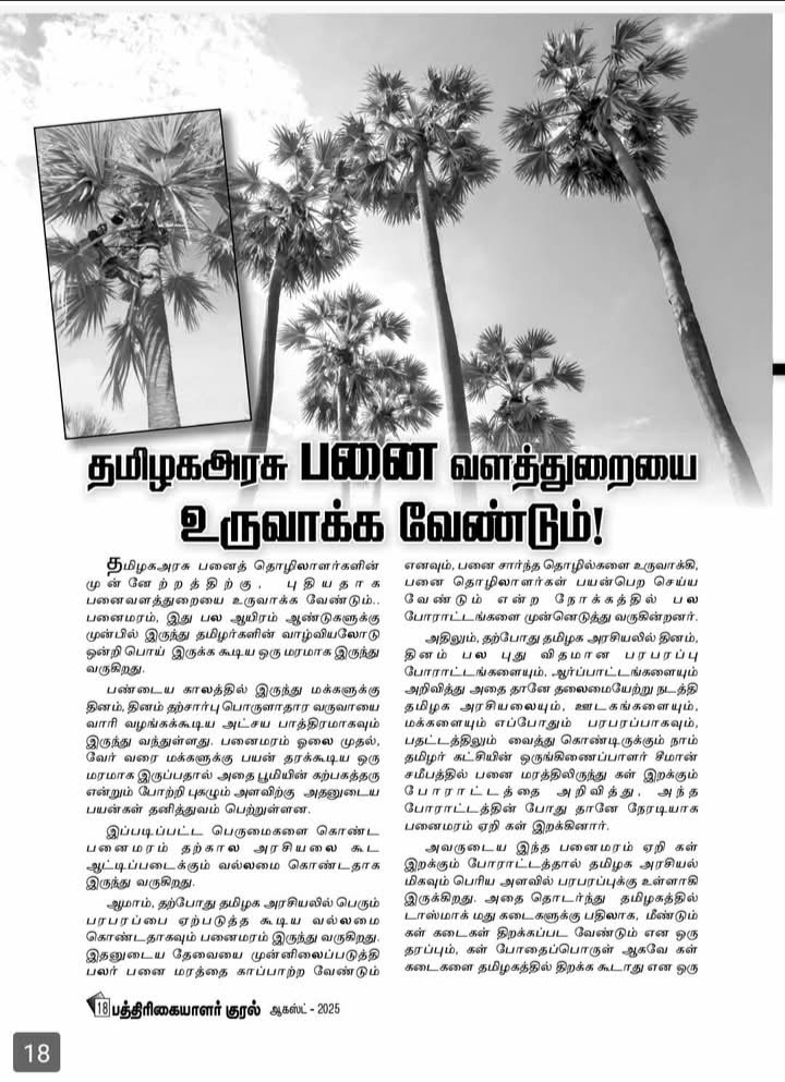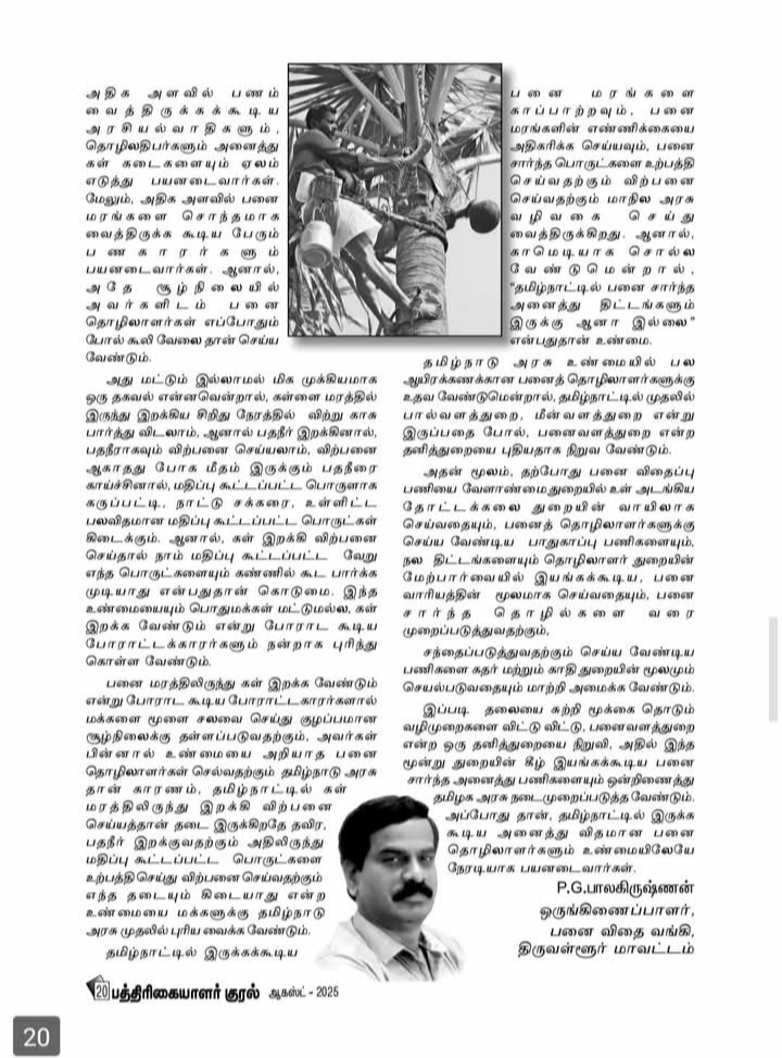 மேலும், ஒன்றை உங்களிடம் சொல்ல நினைக்கின்றேன். கடந்த மூன்று ஆண்டுகளாக நான் திருவள்ளூர் மாவட்டத்தில் பிளாஸ்டிக் பொருட்களுக்கு மாற்றாக, பனை ஓலையில் கைவினைப் பொருட்கள் செய்வதற்கு திருவள்ளூர் மாவட்டம் முழுவதும் இருக்கக்கூடிய பெண்களுக்கு பயிற்சி அளிக்க முயற்சி செய்து நடவடிக்கை மேற்கொண்டேன். அதற்காக, நமது முன்னாள் மாவட்ட ஆட்சியர்கள் ஆல்ஃபி ஜான் வர்கீஸ் அவர்கள் மற்றும் பிரபு சங்கர் அவர்கள் தற்போதைய மாவட்ட ஆட்சியர் அவர்களும் எனக்கு பனை சார்ந்த பணிகளை செய்வதற்கு, பெரும் அளவிற்கு எனக்கு உதவிகளை செய்து வருகிறார்கள். அதன் மூலமாக, தமிழ்நாட்டிலேயே முதல் முறையாக நமது திருவள்ளூர் மாவட்டத்தில் பனைவிதை வங்கி என்ற ஒரு அமைப்பை துவக்கி, அதை நமது திருவள்ளூர் மாவட்ட ஊரக வளர்ச்சி துறையின் மூலம் நான் ஒருங்கிணைப்பாளராக இருந்து திருவள்ளூர் மாவட்டம் முழுவதும் செயல்படுத்தி கொண்டிருக்கிறேன்.