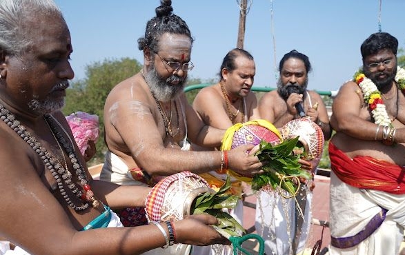 9 மணிக்கு மகாபூர்ணாகதி, 9.15 கலசங்களுடன் புறப்பாடு நடந்தது.