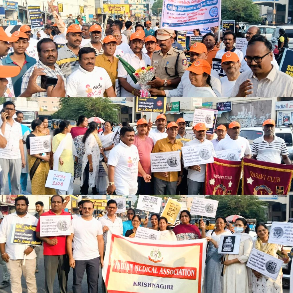 தேர்தல் பிரச்சாரமாக ஜெயராம் வெங்கடேசன், ராதாகிருஷ்ணன் பிரச்சார முழக்கங்களுடன் பேரணி, நூற்றுக்கு மேற்பட்டோர் கலந்துகொண்டு கிருஷ்ணகிரி புதிய பேருந்து நிலையம் முதல் துவங்கி, கிருஷ்ணகிரி புதுப்பேட்டை ரவுண்டானா வரை வணிகர்கள் மற்றும் பொது மக்களுக்கு தேர்தல் பிரச்சார விழிப்புணர்வு ஏற்படுத்தி, பொதுமக்கள் மற்றும் தன்னார்வ அமைப்புகள் என் ஓட்டு விற்பனைக்கு அல்ல, நான் ஓட்டுக்கு பணம் வாங்க மாட்டேன் என்ற உறுதிமொழி எடுத்து நிறைவுற்றது.